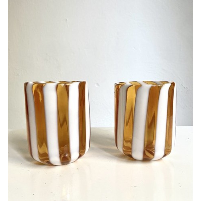 Jump back to Venice in the 90s and you find a fantastic drinking set made by a man who was holding artistry and character. These glasses have been made in a fantastic topazio color very popular in the 90s together with gold white filigrana. These drinking
