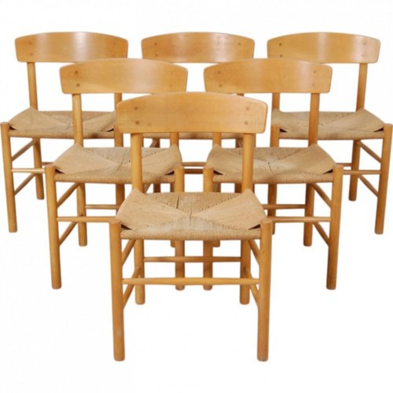 Set of six Brge Mogensen J39 chairs with frames of lacquered beech and seats of paper cord. The chairs are from the 1980s and appears with patina and stains on the paper cord seats and with marks and scratches on the frames. Designer: Brge Mogensen Manufac