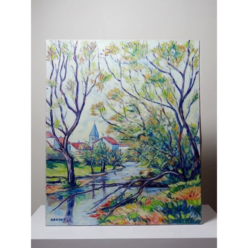Very beautiful painting, relatively large, vintage 80s-90s, oil on wood-chassi linen canvas, pretty village landscape behind a river and spring or autumn trees. Signed Gaulot lower left - Jacques Gaulot - Landscape of eastern France around Chaumont. Very p