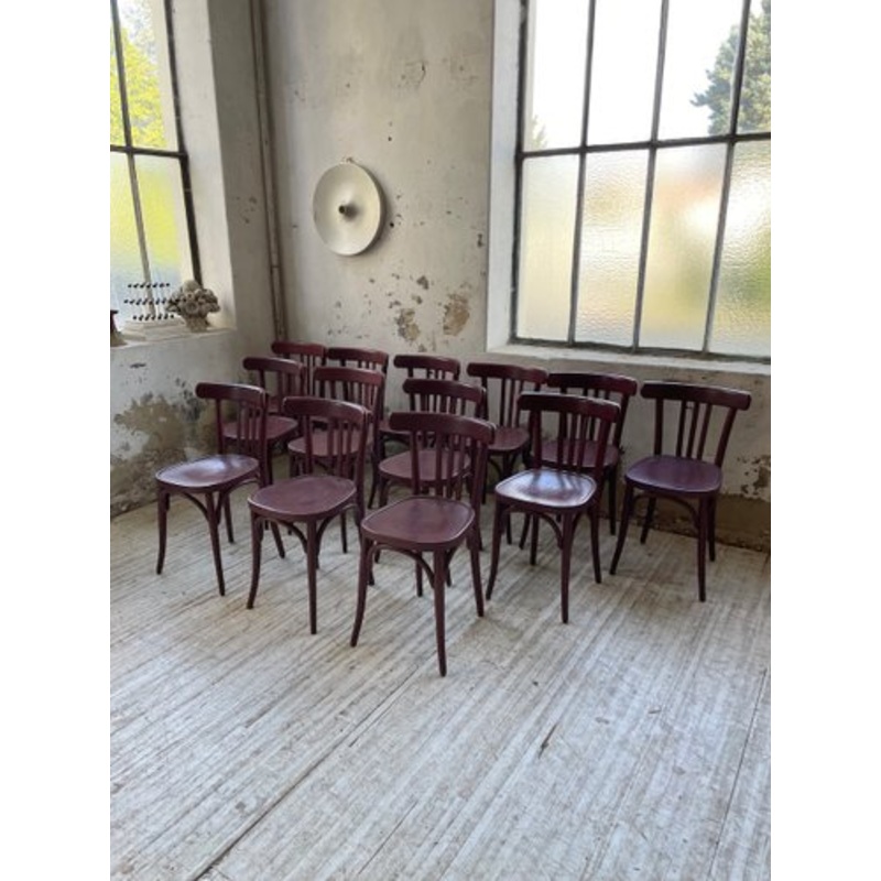 Series of 13 bistro chairs from the 1940s Japy.They are painted dark burgundy, their seat has a tortoiseshell style covering, inlaid in the wood.General patina on all the chairs, paint skipping in places, marks, one or two chairs have bent wood that has sp