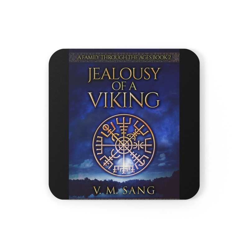 These coasters are made with a high-gloss top and feature a cork back to prevent sliding, and each order comes with a set of four coasters. The cover art in these coasters is from V.M. Sang’s book, Jealousy Of A Viking.