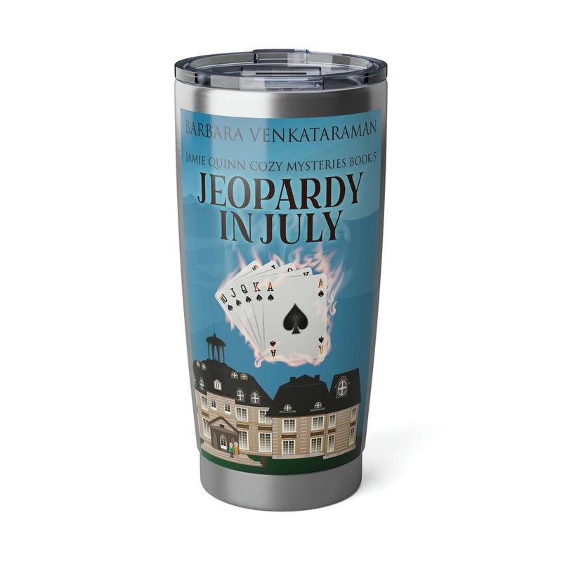 Minimize your plastic footprint with style. This tumbler fits perfectly into car cup holders, and the rubber gasket makes it spill-resistant on bumpier roads. The double-wall insulation makes sure drinks stay at the right temperature until the next pit stop. The cover art in this 20 oz tumbler is from Barbara Venkataraman’s book, Jeopardy In July.