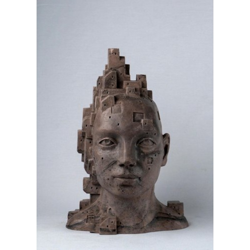 “LarA 009” is a singular sculptural bust from the LarA series by Spanish artist Jos Perozo, created in 2024. This reddish-brown cement bust, enriched with dark veining, presents a striking fusion of human form and architectural landscape. The serene, almost hieratic expression of the face contrasts with the intricate network of cubic structures emerging from the surface, resembling an ancient cityscape gradually overtaking the figure. This interplay between the organic and the constructed evokes both classical monumental sculpture and the dreamlike cityscapes of utopian or dystopian worlds, reminiscent of animated works like those of Studio Ghibli or the mysticism of de Chiricos metaphysical painting. The textured surface, accentuated by the deep earthen tones and charcoal-like veins, lends the piece an air of weathered permanence, as if it were a relic unearthed from an undiscovered civilization. The semi-matte varnish refines the materials natural variations, allowing light to subtly interact with its surface, revealing both smooth and rugged areas that enhance its sculptural depth. Perozos use of high-durability cement highlights the raw physicality of the medium, retaining subtle imperfections such as minuscule air pockets and natural tonal shifts, reinforcing the handcrafted quality of the piece. The composition is further stabilized with fine aggregates for intricate detailing, acrylic fibers to prevent cracking, and a water-reducing agent for enhanced structural consistency. Each sculpture in the LarA series is unique, with variations in tone, surface detail, and patina, ensuring that no two works are identical. This individuality speaks to the artists ongoing exploration of identity, space, and the human form as a site of habitation and transformation.
