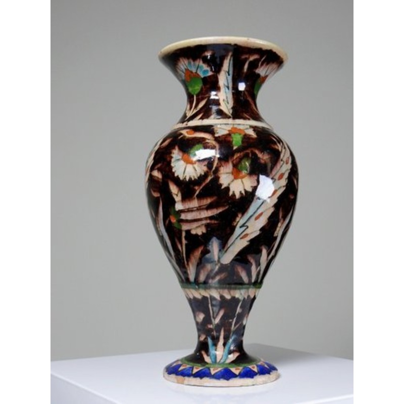 Old Armenian, Palestinian, Ohanessian pottery vase in the Iznik style. Handcrafted signed under the foot Palestine Karakashian-Balian, late 19th century early 20th century. Baluster shape, flared neck, small high foot with rounded base. Pink terracotta, hand painted and glazed. Unusual black/purplish hue, with traditional plant motifs, turquoise blue, green, red, white/pink (transparency), navy blue frieze foot and triangular motifs. 22.5cm in height, 11-12cm in diameter max. Very good general condition, some small losses, notably on the edge of the neck (3) and on the edge of the foot (5), and other discreet traces of time, cracking of the varnish. Around 750gr.