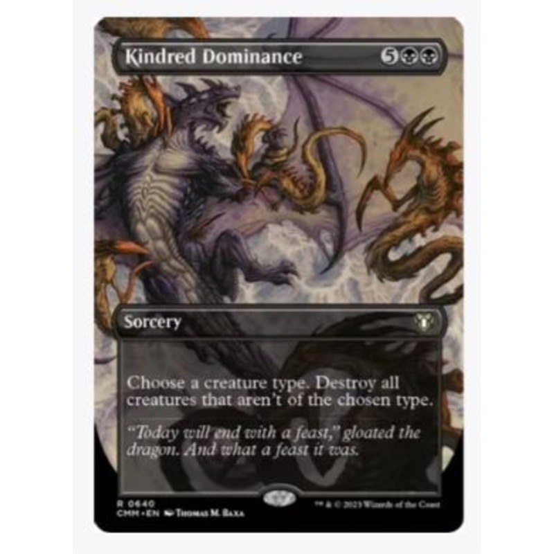 Choose a creature type. Destroy all creatures that aren't of the chosen type.Rarity:R#:640Card Type:SorceryFlavor:"Today will end with a feast," gloated the dragon. And what a feast it was.Casting Cost: 5BB
