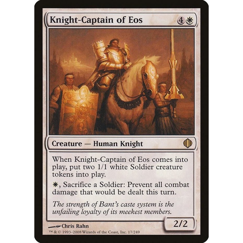 When Knight-Captain of Eos comes into play, put two 1/1 white Soldier creature tokens into play.W, Sacrifice a Soldier: Prevent all combat damage that would be dealt this turn.Rarity:R#:17Card Type:Creature Human KnightP / T:2 / 2Flavor:The strength of Ban