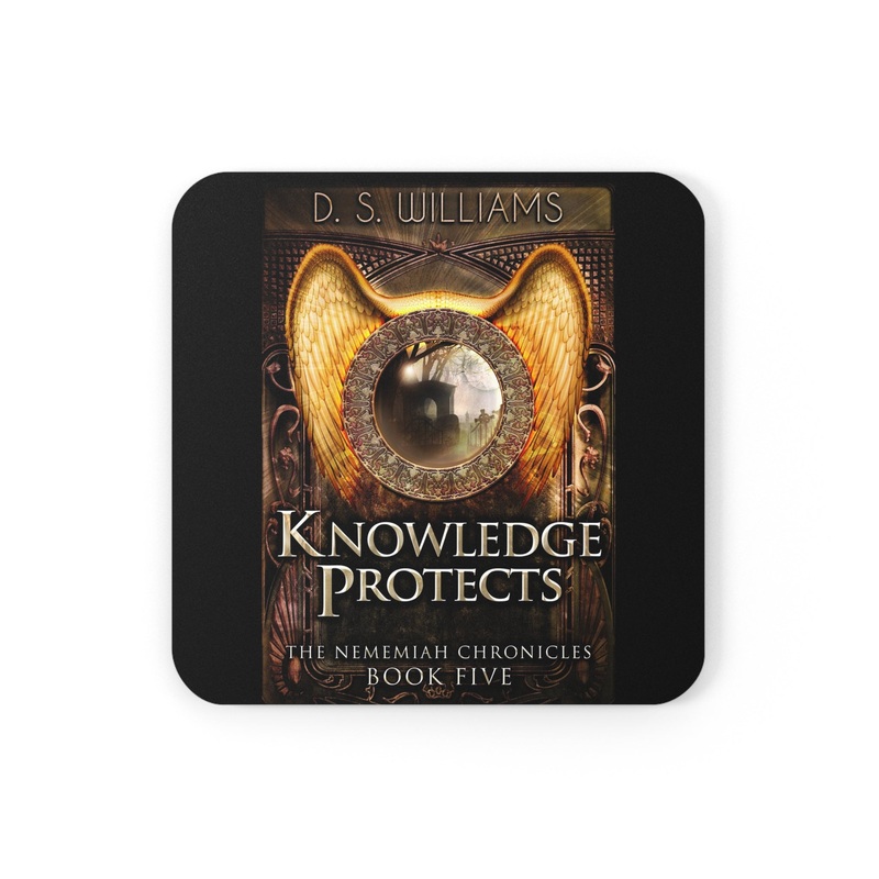 These coasters are made with a high-gloss top and feature a cork back to prevent sliding, and each order comes with a set of four coasters. The cover art in these coasters is from D.S. Williams's book, Knowledge Protects.