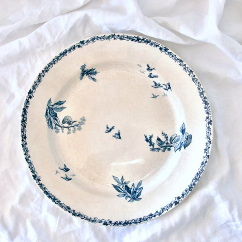 Rare large old round dish from the 19th century, iron earth, stamped Choisy-le-Roi Hippolyte Boulenger (HB&Co). Dish from a very rare collection, almost no longer existing on the market. Magnificent popular decoration of tit or swallow type birds, some sit