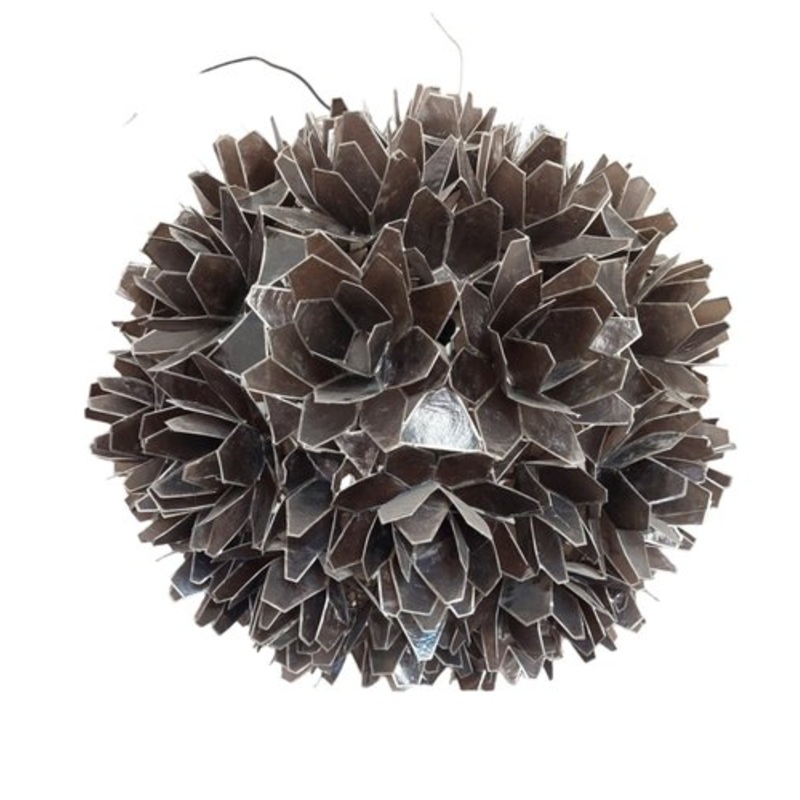 This spectacular ball-shaped pendant lamp is made of "cadiz" shell. A product from the Philippines popular in the 1960s. The individual petals are thin pieces of pearl shell edged in metal. A real handcrafted piece. The effect, when illuminated, transforms
