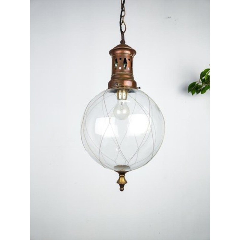 : Beautiful clear globe pendant light caged in brass wire. Constructed out of glass with brass fixture. Design Period 1920 to 1949 Production Period 1930 to 1939 Country of Manufacture Netherlands Style Vintage, Industrial Detailed Condition Very Good This