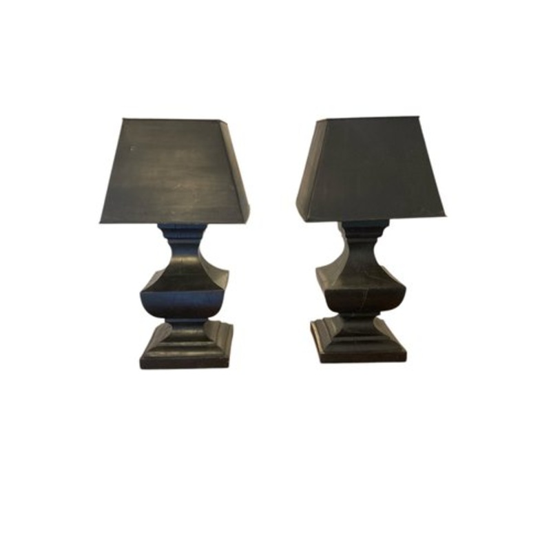 A Pair of Large French Hand Carved Table Lamps, Ebonsied Wood with Black Metal Shades. Early 20th Century. These elegant lamps, mounted on sturdy wooden bases, seamlessly combines industrial charm with rustic appeal. Their sleek design and contrasting mate