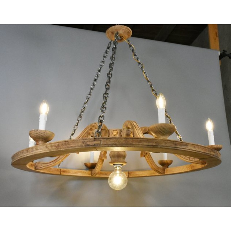 Large French Chandelier in Oak Louis XVI Style with Six ArmsThis wonderful large solid oak chandelier makes a real statement.It hangs from a turned ceiling rose with three hand-made steel chains. The main circular frame of this impressive chandelier compri
