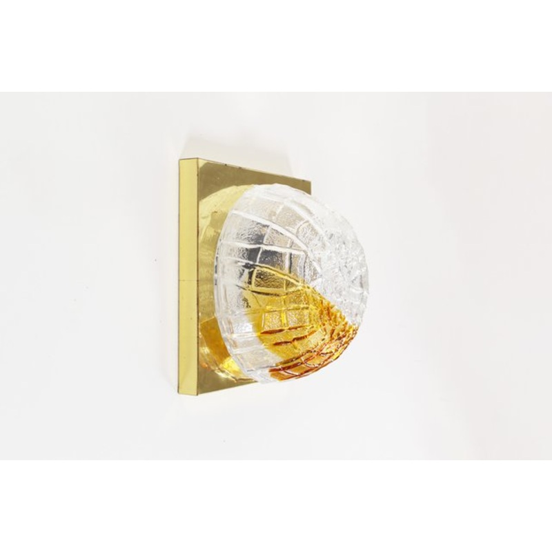 Stunning muranoglass flush mount light by AV Mazzega. Combination of clear and orange colored glass. In great condition with no damages to the glass. The electricity has been replaced to modern standards. Lamp takes 1x E27 bulb under the glass shade. The brass frame shows some oxidation, but not too disturbing when mounted.