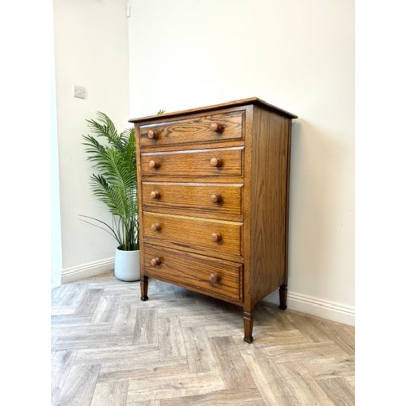 Solid wood large vintage chest of drawers. This is beautifully made with dovetail drawers and wooden handles (not original). All drawers run smooth. This is a vintage piece and has signs of a previous life including marks on the top but is in overall good