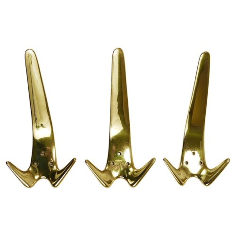 Up to seven Minimalist wall coat hooks, model #4056, designed and executed in the 1950s by Carl Aubock workshop, Vienna/Austria. These are authentic, vintage wall hooks, large, heavy and solid. Made of brass, carefully polished by hand and in good conditio