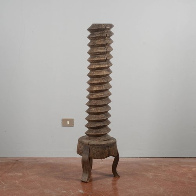 Large wooden grape wine press screw with iron support, 19th century Italy. The object shows woodworms and signs of wear over time but is original in all its parts and can be used to make a floor lamp. measures 38 x 38 x h 131 CATEGORY home decoration rusti