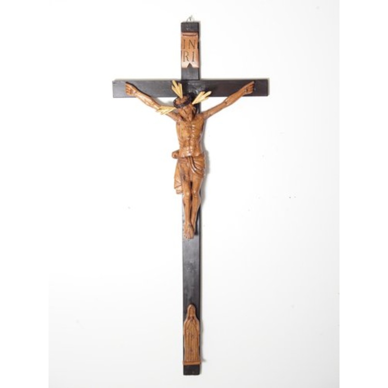 Lime or Linden wood carved body of Jesus on spruce wood cross. Restored. Folk hand crafted, region Bohemia, Vysoina . Conserved with wax, some traces of non active wormwood. Height of Jesus is 42 cm, total height is 110 cm, 47 cm wide.