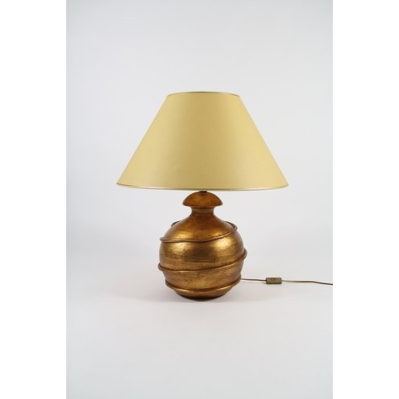 Mid-century modern lamp with strong Art Deco influences, vintage from the 1950s, featuring a massive ceramic base with a decorative gold-toned finish and stylized circular shapes. Large lampshade with edges adorned with a golden cord. Its slightly organic shape and imposing size suggest an affiliation with the luxury decorative design of the 1940s-1950s. Handcrafted in Europe during the 1940s-1950s.