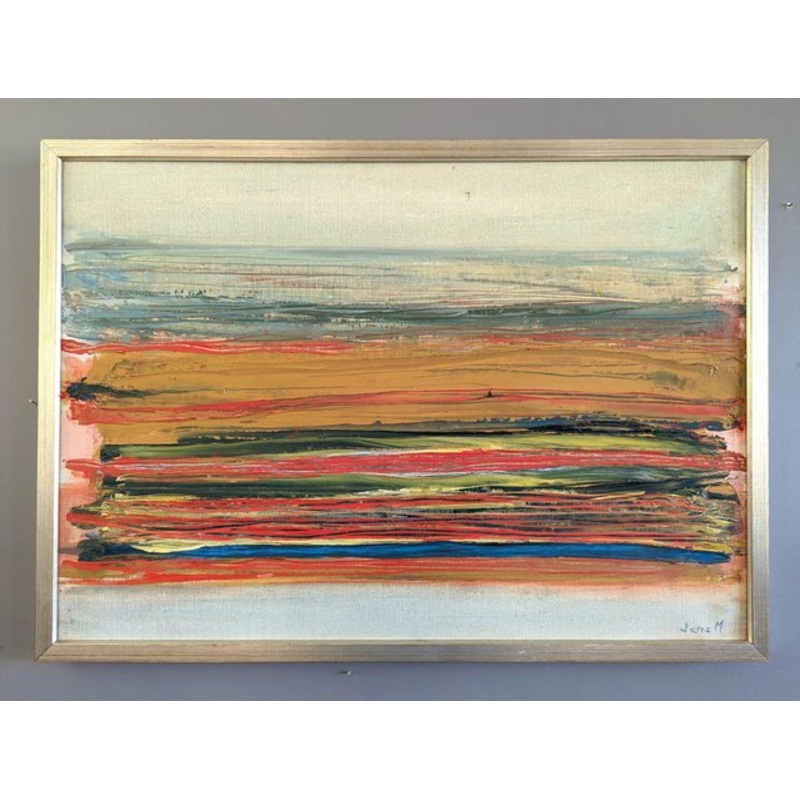 An engaging and striking mid-century abstract landscape painting that captures a dynamic and expressive interpretation of a vast horizon, painted in oil onto canvas. The composition is structured into horizontal bands of colour, evoking a layered terrain of fields and hills, under an expansive sky. The paintings abstract nature allows for multiple interpretations, and there is a focus on colour and form over literal representation. The artist has used a vibrant yet earthy palette, featuring warm oranges, greens, and fiery reds, contrasted against soft blues and off-whites. These colours are applied in thick brushstrokes, creating a beautiful textured surface. The expressive layering and gestural lines contribute to a sense of movement, as if the landscape is shifting under the viewers gaze. This oil on canvas is housed in a complementary champagne frame. The painting is in excellent vintage condition. There is some very minor scuffing to the frame, but it is in good condition overall. Size: 50 x 70cm (including frame)
