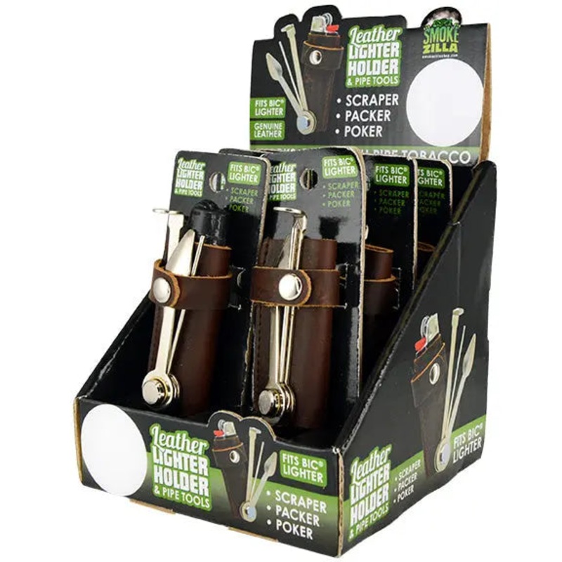 Leather lighter case fits BIC and similarly shaped lighters. Made from genuine leather and includes pipe multi tool with a scraper, packer, and poker. UOM Pieces Dimensions Inches Weight lbs Each 1 5.4H x 2.6W x 1.6L 0.16 Display 6 5.5H x 5W x 4.7L 0.96 Ca