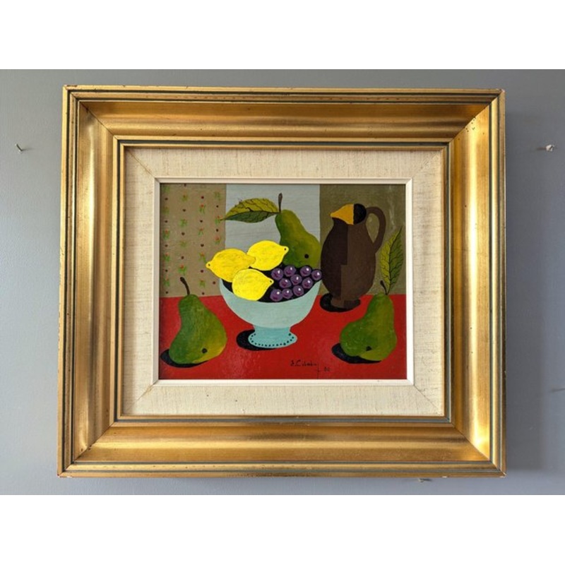 A brilliantly executed and characterful surrealist still life composition, executed in tempera on board and dated 1980, by the established Swedish artist Eric Cederberg (1897-1984), whose artworks have been represented in several public and museum collections across Sweden. The artwork captures an arrangement of bright yellow lemons and rich purple grapes resting in a blue bowl, complemented by green pears placed on a deep red tabletop. A brown pitcher stands in the background, along with patterned wallpaper and a blue wall, adding depth and contrast to the scene. Inviting viewers to revel in the simple beauty of everyday objects, the artist masterfully captures the essence of realism through his meticulous brushwork and keen attention to detail, as well as by simplifying the objects into bold, flat shapes. The colour palette is rich, and the brushstrokes are precise, smooth and clean emphasising the flatness of the shapes and focusing on clarity and boldness rather than texture or intricate detail. This tempera on board is housed in a well-suited gilt frame and and inner linen border. The painting is in excellent vintage condition. There is scuffing to corners and edges of the frame, as shown in the close ups. Size: 34 x 39 cm (including frame)