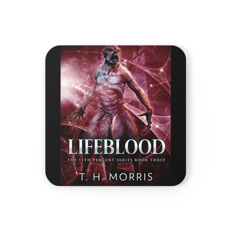 These coasters are made with a high-gloss top and feature a cork back to prevent sliding, and each order comes with a set of four coasters. The cover art in these coasters is from T.H. Morris’s book, Lifeblood.