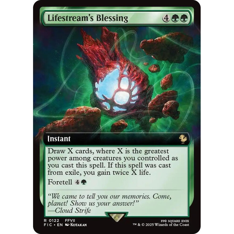 Draw X cards, where X is the greatest power among creatures you controlled as you cast this spell. If this spell was cast from exile, you gain twice X life.Foretell 4GRarity:R#:122Card Type:InstantFlavor:"We came to tell you our memories. Come, planet! Sho