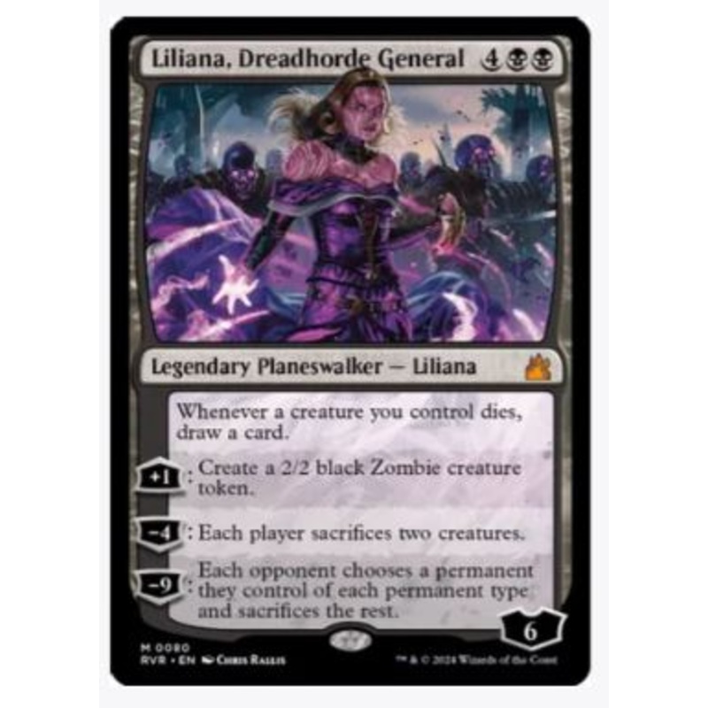 Whenever a creature you control dies, draw a card.[+1]: Create a 2/2 black Zombie creature token.[-4]: Each player sacrifices two creatures.[-9]: Each opponent chooses a permanent they control of each permanent type and sacrifices the rest.Rarity:M#:80Card