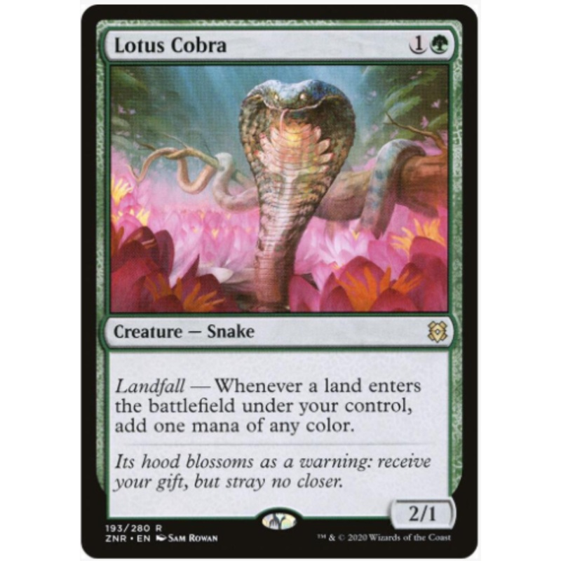 Landfall Whenever a land enters the battlefield under your control, add one mana of any color.Rarity:R#:193Card Type:Creature SnakeP / T:2 / 1Flavor:Its hood blossoms as a warning: receive your gift, but stray no closer.Casting Cost: 1G
