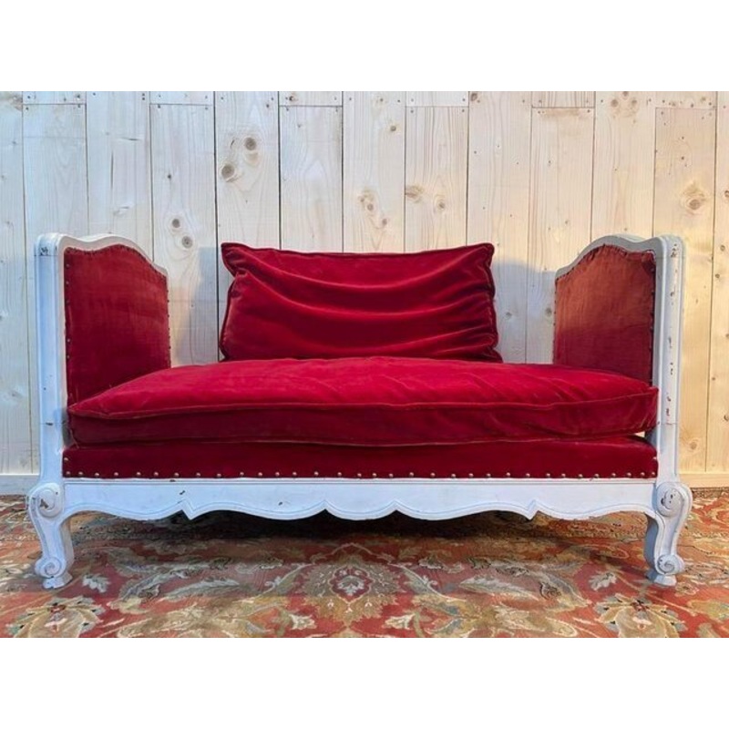 Artist: None Period: 19th century Style: Louis 15th – Transition Condition: Good condition Material: Solid wood Length: 130Width: 130Height: 77Depth: 70 Reference: 1495090 “Sofa / Bench – Louis XV Daybed” Sofa – Louis XV style folding bench in painted wood and red velvet., Maximum 230 cm open.