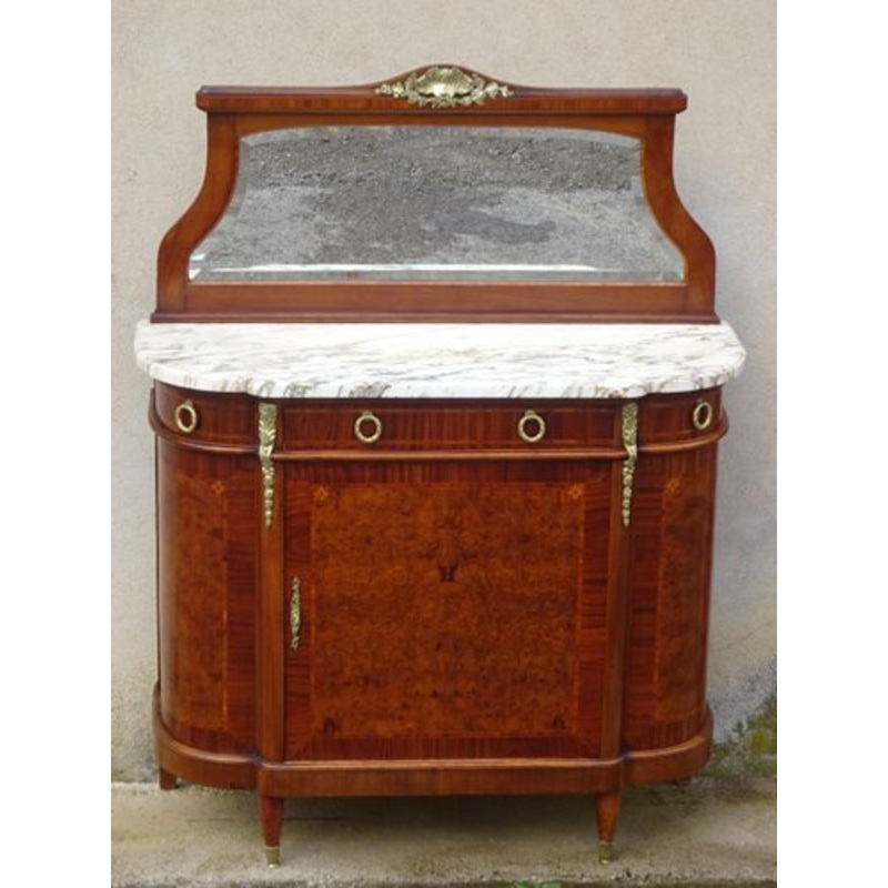 Pretty shallow rounded sideboard, at support height in the Louis XVI style. Bronze ornaments on the pediment of the mirror and on the uprights of the sideboard, reminder of bronze by the drawer handles.Remarkable marquetry work on the entire front of the f