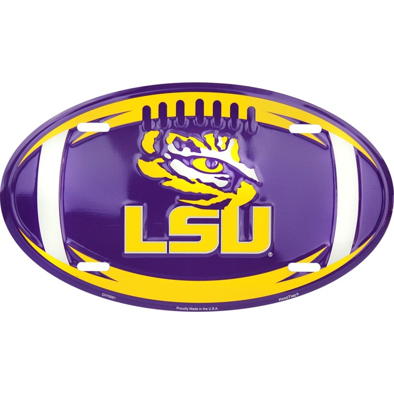 Officially licensed 6" x 12" Louisiana State University LSU Tigers Embossed Metal Oval License Plate Tag Sign. Made of high quality aluminum for a weather resistant finish. It is lightweight & durable. Pre-drilled holes for quick and easy mounting.