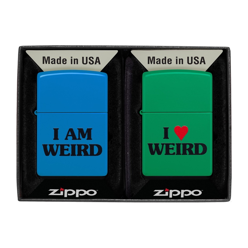 Celebrate a love thats uniquely yours with this two-piece lighter set. Perfect for you and your lovable weirdo, the Grass Green Matte and Sky Blue Matte lighters feature coordinating Color Image designs and come paired in a specialty gift box. For optimal performance, fill with Zippo lighter fuel.