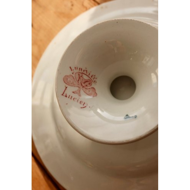 Flat iron earth compotier, from the famous Lucien de Lunville model. Its refined floral decoration, combined with a delicate frieze, gives it a timeless look. Perfect for presenting desserts, fruits or even as a table centerpiece for an authentic decoratio