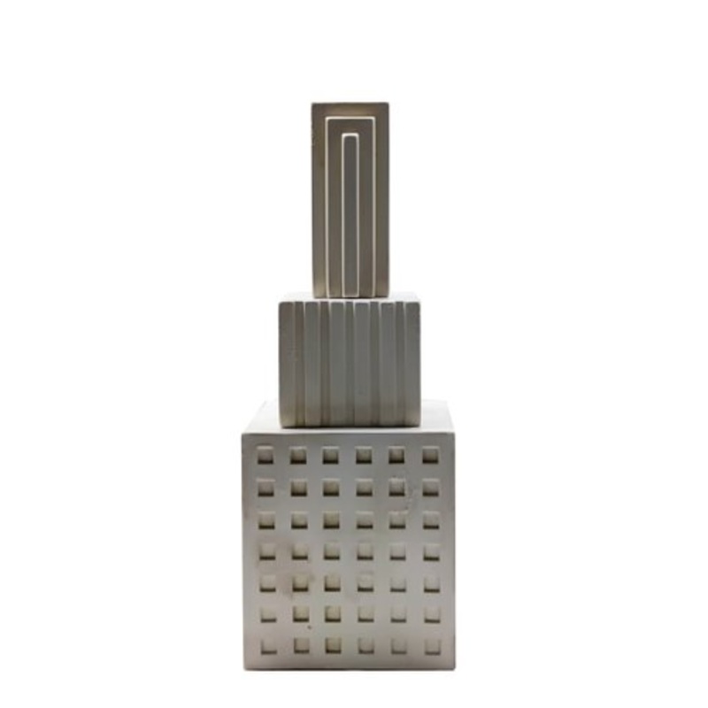 A white ceramic belt sculpture composed of three superimposed elements, each with a different geometric shape: a cube at the base, an intermediate parallelepiped and a stepped structure at the top. Each element has geometric motifs engraved or in relief. The cube at the base is decorated with a series of squares and lozenges arranged in a regular pattern. The middle parallelepiped has vertical grooves, while the upper structure is characterised by horizontal steps.Luisa Russo is an artist who works with various techniques, including sculpture. Her works are characterised by a strong interest in geometry and optical illusion.