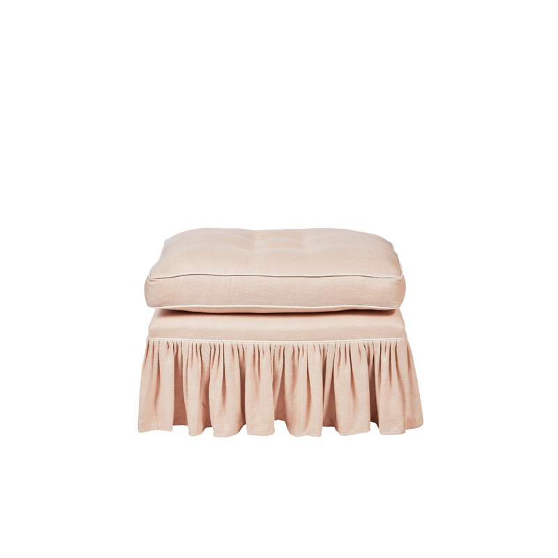 The latest addition to our Mabel family, a buttoned stool. Adorable, chic, and comfortable. Available with or without the frill. [SHORTDESCRIPTION]Upholstered in Nina Campbell Poquelin Colette Blush NCF4321-04 and piped in Colette Ivory NCF4321-06Dimension