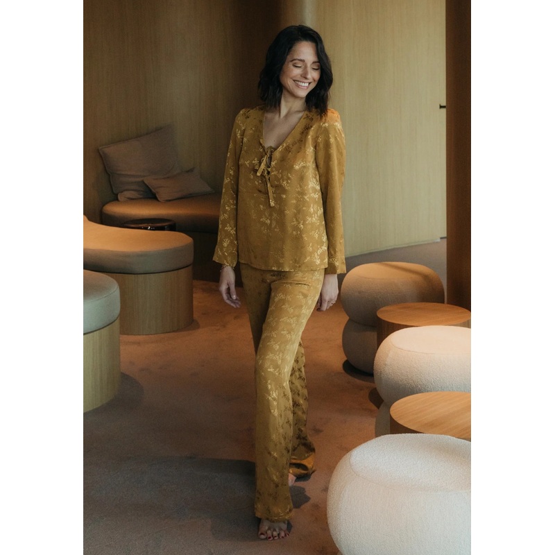 Slip into your handmade pyjama, and with a sigh of comfort, surrender to sleep.The lovely SOUPIR pattern combines ultimate comfort with those little details that make your creation the most refined of loungewear:A blouse with a wide neckline tied with deli