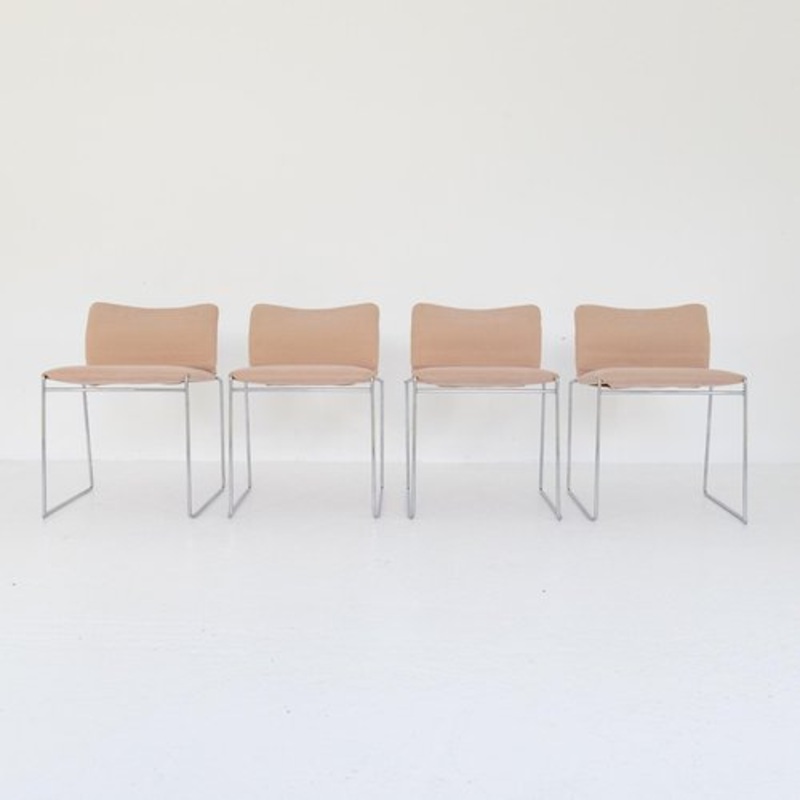 Four stackable chairs model Maja designed by Kazuhide Takahama and produced by Gavina in the 1970s. Chrome-plated tubular metal frame, upholstered back and seat covered with removable pink original fabric. Creator Kazuhide Takahama Manufacturer Gavina Desi