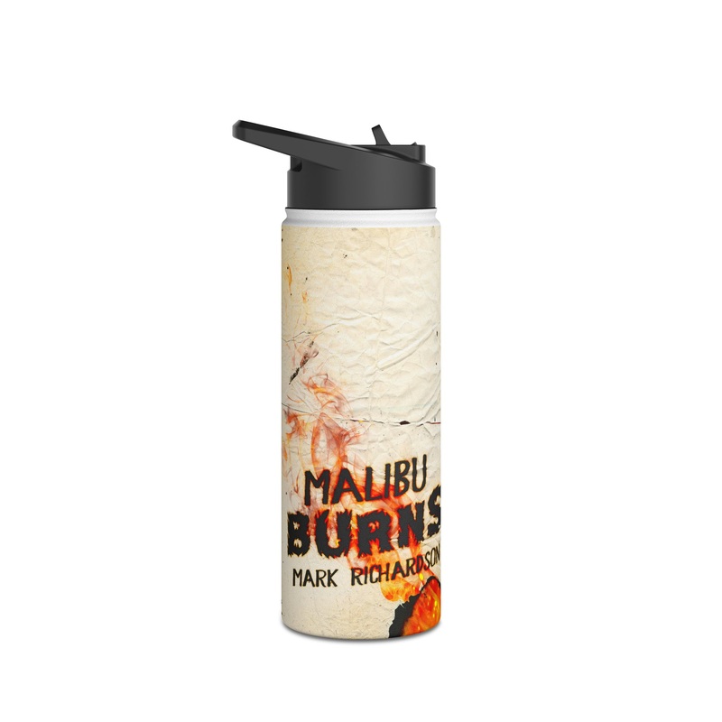 Quench your thirst in style with this 18oz stainless steel water bottle featuring a double-wall stainless steel build that keeps your drinks frosty for 24h and soothingly hot for 12h. This BPA-free, steel water bottle comes with a twist-on lid for easy sipping, making it excellent for daily use at work, at college, in the car, and beyond. The cover art in this water bottle is from Mark Richardson’s book, Malibu Burns.