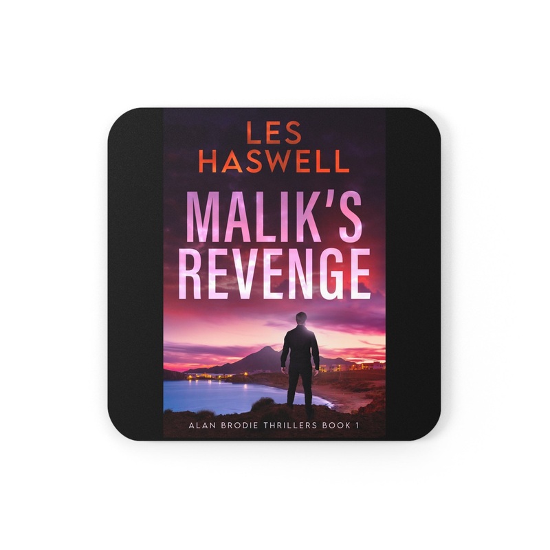 These coasters are made with a high-gloss top and feature a cork back to prevent sliding, and each order comes with a set of four coasters. The cover art in these coasters is from Les Haswell’s book, Malik’s Revenge.