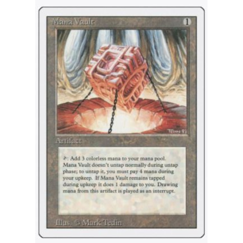 T: Add 3 colorless mana to your mana pool. Mana Vault doesnt untap normally during untap phase; to untap it, you must pay 4 mana during your upkeep. If Mana Vault remains tapped during upkeep it does 1 damage to you. Drawing mana from this artifact is played as an interrupt.