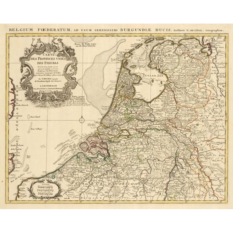 Carte des Provinces Unies des Pays Bas. Amsterdam: Covens & Mortier, c.1730. Original outline colour. 490 x 620mm. A good example of this map of the Netherlands by Delisle, here published in Amsterdam by Covens & Mortier. with a large decorative title cart