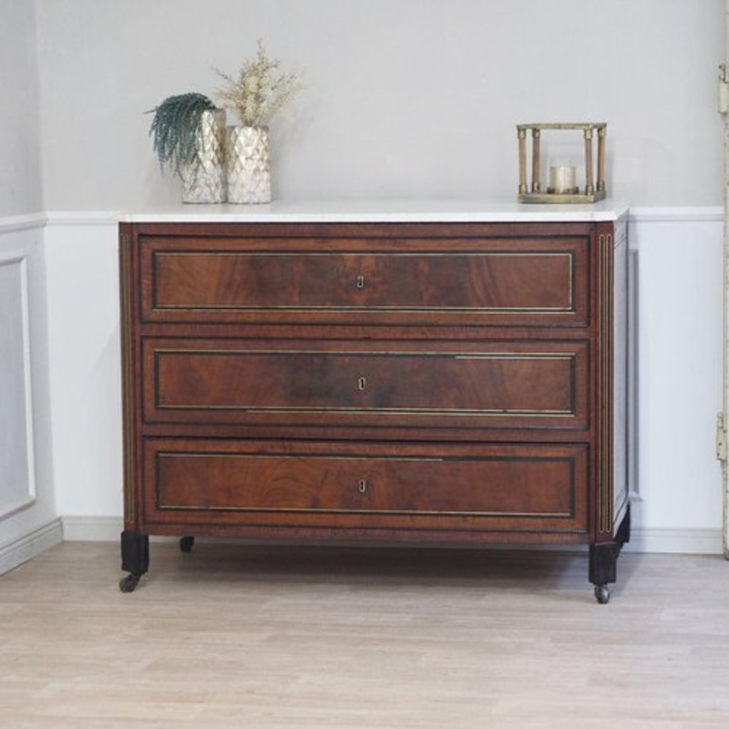 Origin: France Dimensions in cm: H 99 / W 130 / D 64 Characters or special features: Elegant mahogany chest of drawers with brass decorations and bevelled white marble top, three deep drawers, standing on wheels, a stylish eye-catcher for many rooms, a very old treasure Condition: Good, refurbished and cared for, age-related signs of wear (side cracks and old wormholes, drawers not lockable)