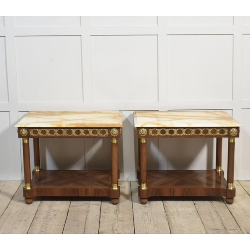 Pair of side tables, the well-figured marble tops with moulded edge, to the freeze with gilt metal mounted detail. Raised on circular supports united by under tier. Dimensions Height 24 Inches Width 29.5 Inches Depth 20 Inches