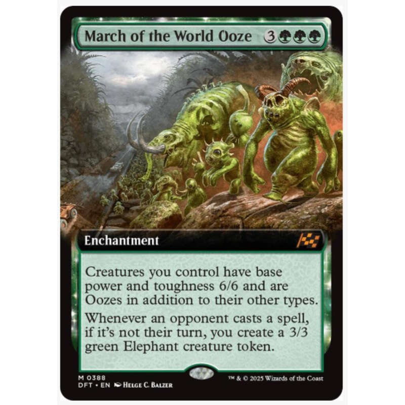 Creatures you control have base power and toughness 6/6 and are Oozes in addition to their other types.Whenever an opponent casts a spell, if it's not their turn, you create a 3/3 green Elephant creature token.Rarity:M#:388Card Type:EnchantmentCasting Cost