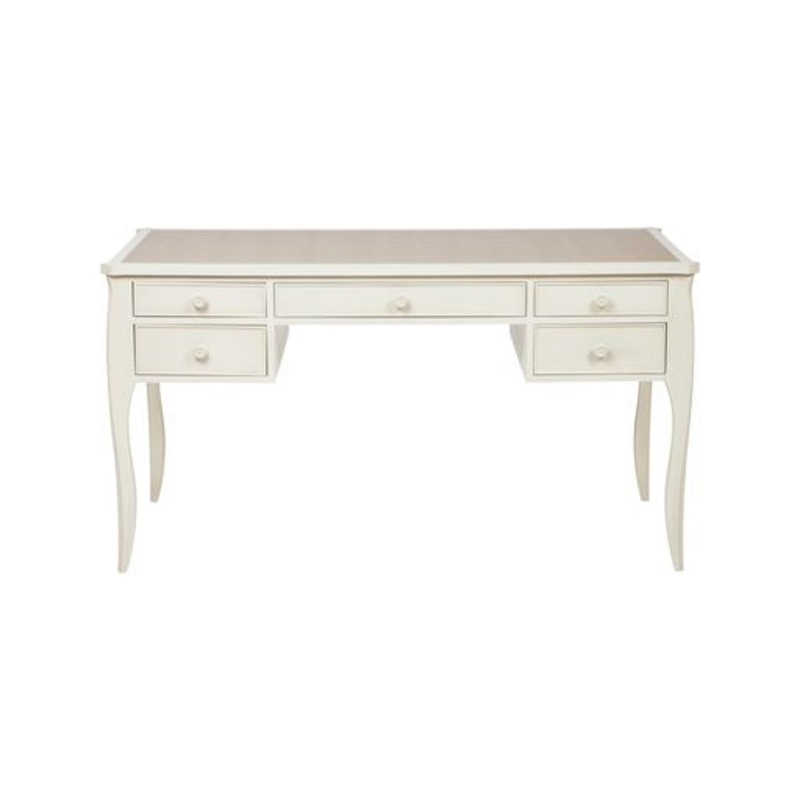 This beautiful desk with curved legs offers 5 drawers of storage with turned handles. With a faux leather top and lined drawers, colour can be chosen within our range, the desk has a drag paint finish.[SHORTDESCRIPTION] Available in Mineral White and with a faux leather in taupe