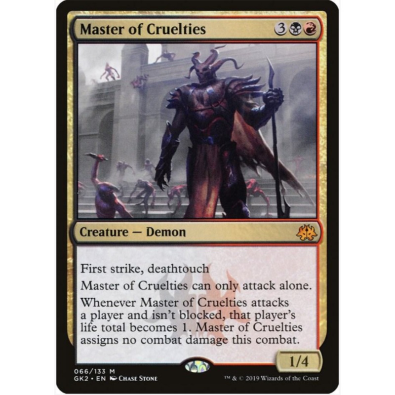 First strike, deathtouchMaster of Cruelties can only attack alone.Whenever Master of Cruelties attacks a player and isn't blocked, that player's life total becomes 1. Master of Cruelties assigns no combat damage this combat.Rarity:M#:66Card Type:Creature D