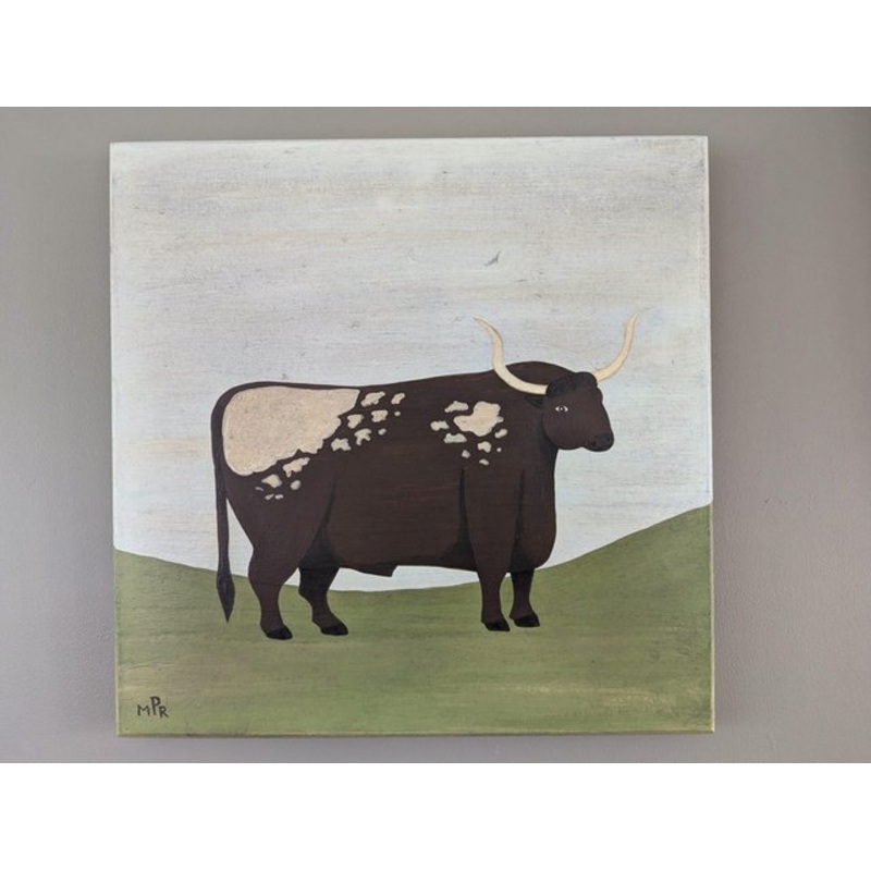 A small and engaging animal composition , painted in a nave style in oil onto panel, by British artist Matt Rix. The painting features a black and white longhorn cow standing on a softly rolling green hill against a light, muted sky. The cow is shown in side profile, with a calm expression and simple, expressive eyes. Its large curved horns give it a distinctive presence, emphasizing its strength and elegance. This painting is a charming, rustic folk-art piece that celebrates rural life with a focus on simple forms and earthy colours. The calm presence of the cow, combined with the soft landscape, creates a warm, nostalgic feel, making it a beautiful and timeless representation of pastoral life. This oil is painted onto panel which although unframed, is meant to be hung as is. The painting is in excellent vintage condition. British artist Matt Rix spent his childhood in South Africa and now lives with his family on a small holding in rural North Wales. His paintings are uncomplicated, modernist representations influenced by primitive and nave folk art from times past. Many of the subjects Rix paints are inspired by the animals he sees from day to day. Rix uses recycled materials including discarded paints, boards, frames and backing paper. Much of his work is therefore produced using waste materials resulting in sustainable paintings that evoke a time-worn, nostalgic essence. Size: 30.5 x 30.5 cm (including frame)