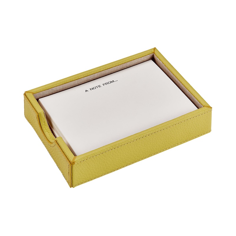 This beautifully crafted leather tray holds 4" x 6" note cards for quick notes and memos.[SHORTDESCRIPTION]Size: 5" x 7"Comes with 25 cards