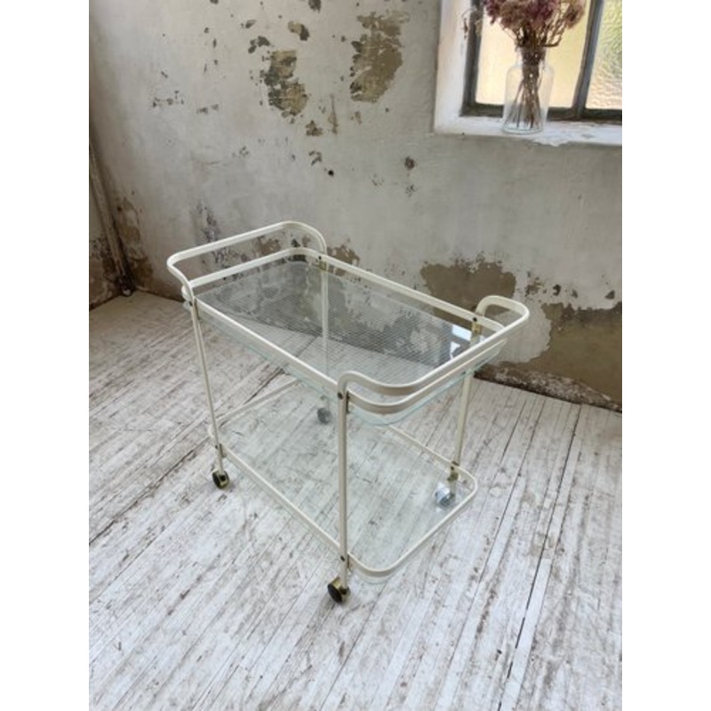 Service trolley or trolley on wheels from the 80s composed of an off-white lacquered metal structure and two glass levels with white grid.